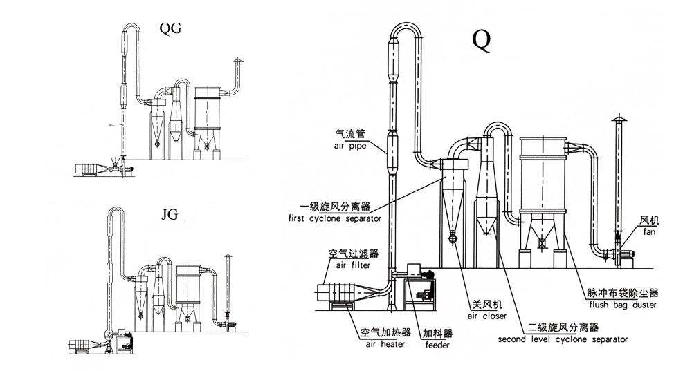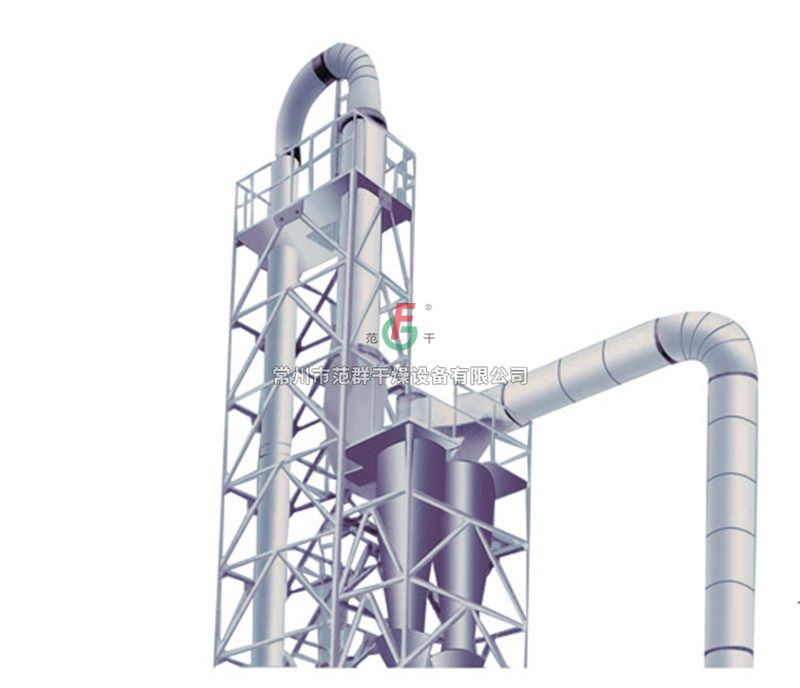 濕物料經輸送機與加熱后的自然空氣同時進入干燥器,二者充分混和,由于熱質交換面積大,從而在很短的時間內達到蒸發干燥的目的。干燥后的成品從旋風分離器排出,一小部飛粉由旋風除塵器或布袋除塵器得到回收利用。Q型氣流干燥器是負壓操作,物料不經過風機;QG型氣流干燥器是正壓操作;物料經過風機帶有粉碎作用;FG型氣流干燥器是尾氣循環型;JG型氣流干燥器是強化型氣流干燥器,其集閃蒸干燥與氣流干燥為一體,是我公司根據用戶要求設計的新型干燥設備。