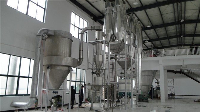 加熱到一定溫度后吹入直立管,在管內(nèi)的速度決定于濕顆粒的大小和密度,一般大于顆粒的沉降速度(約為10~20米/秒)。已干燥的顆粒被強(qiáng)烈氣流帶出,送到兩個并聯(lián)的旋風(fēng)分離器分離出來,經(jīng)螺旋輸送器送出,尾氣則經(jīng)袋式過濾器放空。由于停留時間短,對某些產(chǎn)品往往須采用二級或多級串聯(lián)流程。